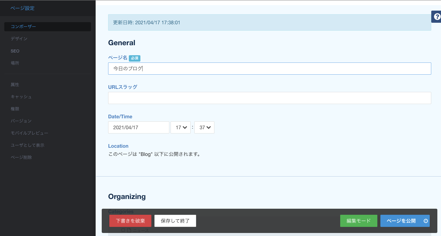 新しくブログを追加するのは右上のページを追加からBlog Postを選択します。