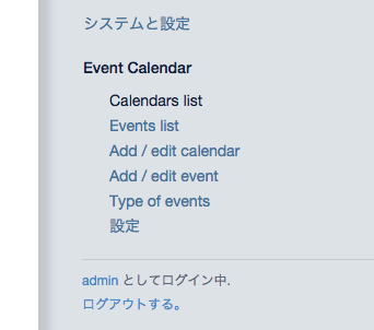 管理画面>Event Calendar>Calendar list を選択し、Add calendarボタンをクリックしてタイトル名を入力しカレンダーを追加します。